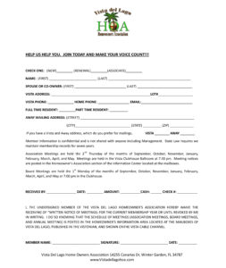 - As a homeowner in Vista Del Lago, you are automatically a member of the Vista Del Lago Homeowners Association but not a paid a member.